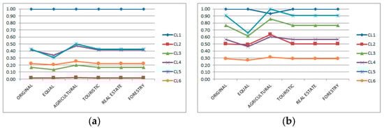 The results of the sensitivity analysis for the MAI landscape are reported respectively in Figure 7a,b. As it is possible to see, 6 scenarios have been generated having the original weight condition, the equal weight condition and other 4 situations in which one category is predominant. The results of the sensitivity analysis show a variability in the values (Table 11), which is mainly related to the tourism scenario, while in the other scenarios the number remains the same. This variation in the tourism scenario has to be attributed to the fact that tourism presences are mostly concentrated in the city of Ivrea, whereas the other clusters are represented by small centers. In this sense, it is possible to affirm that the landscape is constituted by a highly polycentric system where Ivrea predominates on the other centers. For this reason, when the tourism category assumes a very high importance in the calculation of LEA and SLEA indices, the values becomes very low for the majority of the clusters which have very low performance in terms of tourism, while a very high for the cluster of Ivrea. In the light of this explanation the results of the model can be considered acceptable, thus validating the calculations done.