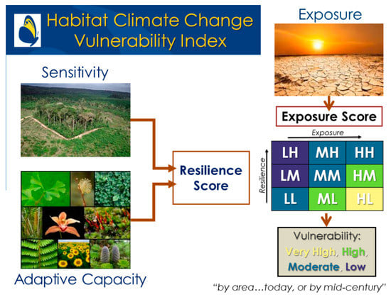 This index approach to vulnerability assessment aims to organize a series of sub-analyses in a coherent structure that will shed light on distinct components of vulnerability, so that each can be evaluated individually, or in combination. Our approach parallels related indexing of climate change vulnerabilities for species []. The components of climate change vulnerability are organized into primary categories of Exposure and Resilience. Resilience is further subdivided into subcategories of Sensitivity and Adaptive Capacity (Figure 1). For the HCCVI, these terms are defined as follows: