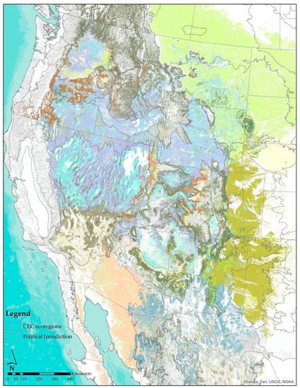 Mapped distributions of 52 ecological system types (too numerous to list here) in Western North America, centered on the USA, with boundaries of the Commission for Economic Cooperation CEC ecoregions [] used for reporting on vulnerability.