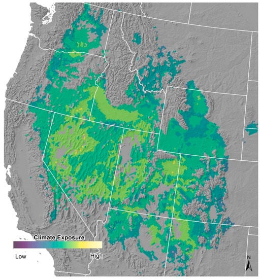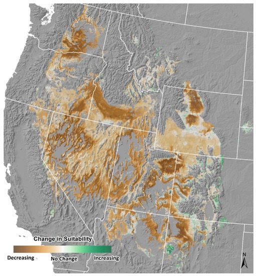Typicality (0.0 to 0.5) and Change in Climate Suitability (0.0 to 0.5) measures were then added together to produce an overall exposure measure, resulting in per pixel values within a 0.0–1.0 range, with 1.0 indicating high climate exposure and 0.0 indicating no measurable climate exposure. These per-pixel values were subsequently inverted and averaged for one measure per 100 km2 hexagon. Figure 3 illustrates one example of mid-21st century estimates of increasing or decreasing climate suitability for one major big sagebrush vegetation type. One can see where most substantial decreases in climate suitability for this type are concentrated in such places as Southeastern Washington, the Snake River Plain of Southern Idaho, Northwestern Nevada, the Big Horn Basin of Wyoming, and the Uinta Basin of Utah.