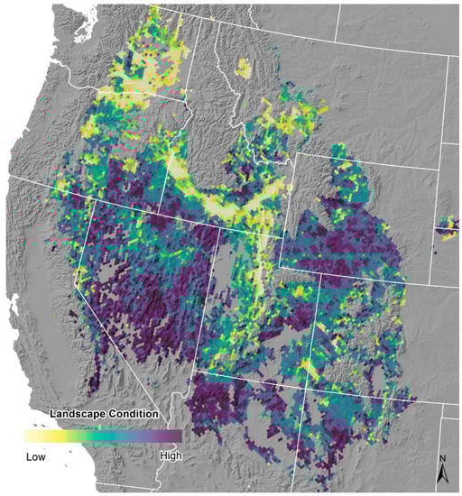 Values close to 1.0 indicate almost no measurable ecological impact from the land use at a given pixel. As described in [], model parameters were calibrated, and subsequently validated using tens of thousands of field observations indicating relative ecological condition. The result is a map surface that provides relative index scores per pixel between 0.0 and 1.0. Calibration of this model against over 50,000 field occurrences ranked as A = excellent, B = good, C = fair, and D = poor condition was used to identify thresholds in the 0.0–1.0 scale for applications. In this instance, we used one standard deviation above the mean of the index value for the D occurrences to determine the C. vs. D threshold. The overall threshold value breaks are as follows; A-Rank ≥ 0.36, B-Rank ≥ 0.30, C-Rank ≥ 0.25, D-Rank < 0.25. Per pixel scores were summarized to average values per vegetation type per 100 km2 hexagon for display.