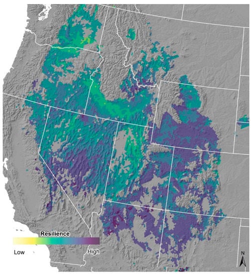 Resilience encompasses intrinsic factors that are likely to affect ecological responses of the natural community to changing climate. These include factors commonly described for ecological resilience, as defined by Holling [] and Gunderson []. Walker et al. [] defined ecological resilience as “the capacity of a system to absorb disturbance and reorganize while undergoing change and while still retaining essentially the same function, structure, identity, and feedbacks.” Under the broader measure of resilience, we include subcategories of Sensitivity and Adaptive Capacity.