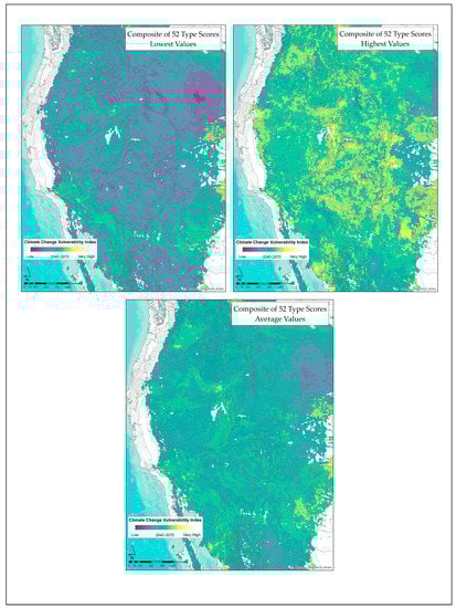Overall Climate Change Vulnerability estimate for 2040–2070 summarized by 100 km2 hexagon for all 52 assessed types, with a minimum of one type and a maximum of 24 types occurring within each hexagon, displayed scores include the least, most, and average vulnerability scores (left to right to bottom).