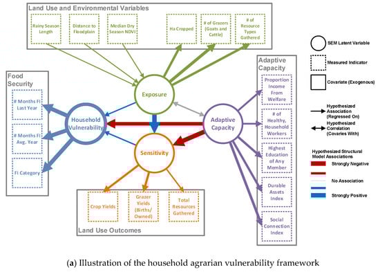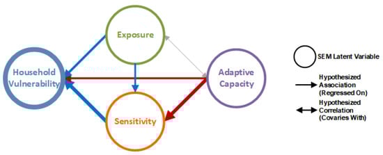 The modeling approach we propose is a structural equation model (SEM) to examine the strength and direction of relationships among the latent (not directly measurable) properties of vulnerability, exposure, sensitivity, and adaptive capacity [36]. We acknowledge that the functional forms with which to quantify or approximate household vulnerability and associated measures of exposure, sensitivity and adaptive capacity are diverse, and vary based primarily on definitions appropriate to specific contexts [8,37]. However, we address this challenge by treating vulnerability and associated components as latent constructs, which is conceptually flexible in allowing a diversity of potential definitions to be applied to these components. Being latent, vulnerability is not something that can be measured directly [10] but manifested (and defined) through measurable indicators (e.g., nutritional intake, morbidity, and mortality, food insecurity, etc.). We contend that the components that combine to create that vulnerability, namely sensitivity, exposure, and adaptive capacity, are similar to latent characteristics that can only be defined and estimated through multiple, correlated but measurable, indicators. This is described by Bollen (2002) as “local independence.” Thus, a model structure that accounts for both direct and indirect relationships, a duality of influence reflected by the indicators measured, can be used for understanding how the components of vulnerability interact in a given system [38]. Additional introduction and explanations of structural equation models are found in the following sources [39,40,41].
