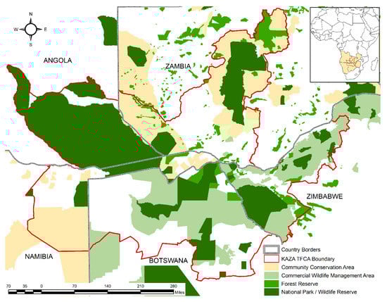 - Cumming, D.H.M. Large Scale Conservation Planning and Priorities for the Kavango-Zambezi Transfrontier Conservation Area; Conservation International: Arlington, VA, USA, 2008. [Google Scholar]