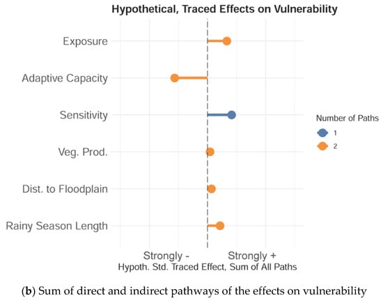 Be estimating the effects of a hypothesized intervention, we assume that the intervention in question is going to target a structural component in the model. Such an intervention would therefore translate, according to the strength of the correlations with the measured, indicator variables, to outcomes in those variables. Thus, it is important to consider the temporal aspect of a given intervention on the correlative strengths that connect the measured and structured parts of the vulnerability model. Any intervention will influence the strength of association between measured indicators and their latent constructs, but the relationships will change based on which latent construct is targeted (e.g., vulnerability, sensitivity, or adaptive capacity) and the timeframe needed to observe a change in the overall vulnerability model. A vulnerable condition is not static but oftentimes we are forced to assess and measure that state as a snapshot in time [73]. These types of longitudinal impacts, or studies of vulnerability across time might be well served by the proposed conceptual framing. Recent studies emphasize the importance of new methodologies to generate insight into longitudinal studies of vulnerability and associated features of these systems have been proposed [74]. We believe that the considerations and advances in incorporating pre–post impact assessments, trend analyses, and longitudinal data in general can be incorporated into the SEM-based framework. In its most general case, however, we are most interested in the combined effect on vulnerability and its indicators that results from any single intervention that affects a household’s adaptive capacity or sensitivity. The impact of such an intervention on the latent and measured outcomes of household vulnerability may include not just the direct paths linking these structural components, but also the indirect paths, such as the two pathways between adaptive capacity and vulnerability (direct and the one through sensitivity) (Figure 4a,b).