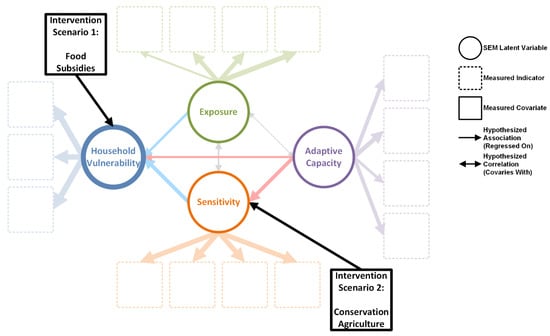 Using an SEM approach to estimate the degrees to which latent components of household vulnerability relate, we may incorporate other covarying factors such as interventions or group-level effects. These may be estimates of previous or potential intervening scenarios at the household level designed to reduce vulnerability.