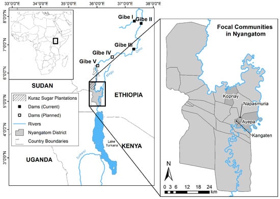 The agro-pastoral Nyangatom people inhabit a part of the Lower Omo Valley in Ethiopia and adjacent western lowlands and mountain piedmonts in South Sudan [57] (see Figure 1). The latest census data (2007) indicated there were approximately 17,000 people living in Nyangatom woreda (equivalent to a district in the Ethiopian administrative system). Given high growth rates, these figures are conservative and more recent estimates are around 30,000 in Ethiopia and a similar number in South Sudan [58,59,60]. The administrative center for the Nyangatom woreda is Kangaten, which is located on the eastern bank of the Omo River and was recently the site of major construction for a bridge (2015). Constructed to enable road access to the sugar development plots located in the Kuraz region of the Lower Omo, the bridge has led to rapid urbanization by non-Nyangatom [59]. Nyangatom settlements extend from riverine forest along the Omo River into the upland plains of the region, and are therefore dependent on a range of ES to support diverse livelihoods: pastoralism for those based in the plains and flood-retreat agriculture on riverside flats, with subsidiary fishing and exploitation of forest resources [61]. This combination of diverse livelihood strategies allows the Nyangatom to exploit seasonally fluctuating resources and to spread the risk of failure. Traditionally, mobility was common and allowed communities to maintain complex social and material exchange with Nyangatom settlements specializing in other livelihoods [57,61]. The region is also characterized by a history of conflict between the Nyangatom, Daasanech, and Turkana indigenous pastoralist groups over grazing lands and water resources [57,61].