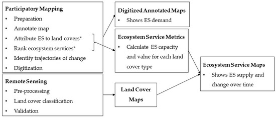 The proposed methodology for integrating participatory mapping and remote sensing to produce ecosystem service maps. The results from participatory mapping annotated with * were used as weights in the metrics and for generating provisioning ecosystem service maps.