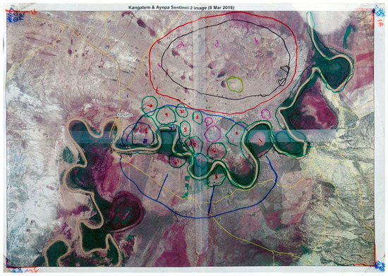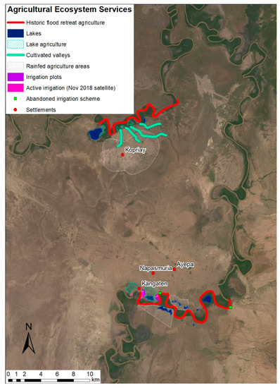 - Flood retreat agriculture (red on Figure 4): cultivation in the rich silt left along the river banks as the flood recedes [56,76], no longer available as there have been no floods since 2016. As one female participation said, “we don’t talk about the Omo, because the Omo is no more”.