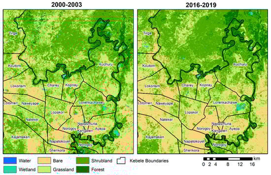 Validation: Land cover maps were validated using ground data points recorded in the field in July 2018 using the SW Maps App [75] on Android devices with built-in GPSs. Ground data were collected both on foot, during transect walks and community visits, and from vehicles during travel between communities and to specific sites mentioned by focus groups. Following fieldwork, ground data were quality controlled and ‘cleaned’ to move points off roads using ArcGIS software and high-resolution imagery. Due to difficulties collecting sufficient water and wetland points in the field, additional randomly distributed ‘ground-truth’ points were generated for these classes using ArcMap and visual interpretation of high-resolution imagery. In total, 702 validation points were used, 389 of which were added retrospectively mainly for the water, forest and wetland categories. The 2016–2019 map was validated using the full dataset while the 2000–2003 map was validated using only points that had remained unchanged and had the same land cover type in both maps. Accuracy matrices were generated and the total accuracy and kappa coefficient for each map was calculated to assess the classification uncertainty (c.f., Tables S3 and S4 in the supplementary material).