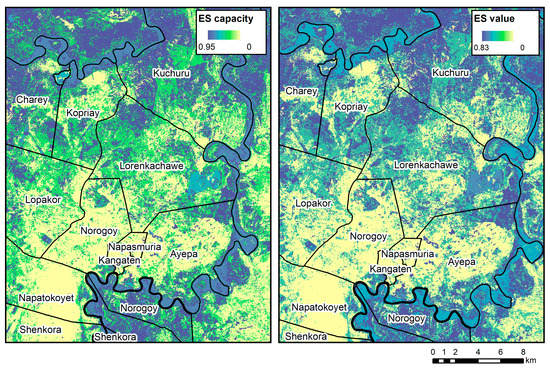 Individual ES reported by communities were grouped into service categories (Fish; Honey; TFF; Shade; Livestock; Crops; Water; Wild fruits and Bush meat) to enable integration with the importance rankings that were used as weightings for calculating ES value. The number of services and number of ES categories provided by each land cover type was determined from the capacity matrix for each community. The service-specific capacities—i.e., the capacity of the land cover type x to provide service y—were aggregated by summing up the capacity scores for all individual services in each ES category to give an ES category-specific capacity.