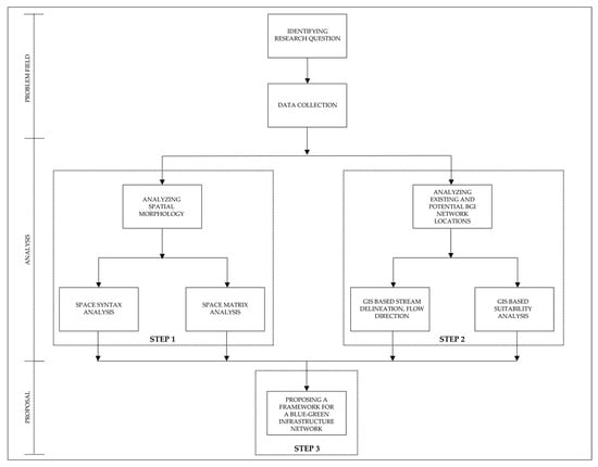 We addressed our research question—how the urban structure can be adapted to mediate between the need to accommodate population growth while preserving natural resources—by taking a three-step approach described below (see Figure 3). The process of designing a BGI network, including the methodology and results of this three-step approach, is presented in this section. We collected GIS data from Dhaka City Corporation (administrative boundaries, parcel boundaries, building footprints, building heights, number of stories per building), Dhaka Water Supply and Sewerage Authority (rivers and waterways, wetlands, topography, and flood plains), Geodash (parks and open spaces), and Bengal institute (streets and other infrastructure).