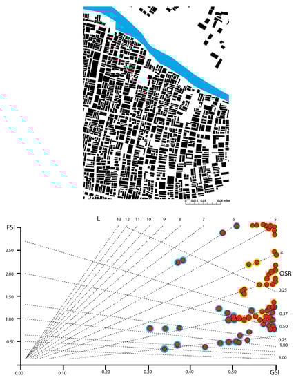 The method of Spacematrix is used to efficiently calculate urban density and understand the correlation of density and urban form—as well as the composition of built and unbuilt areas—by taking the street block as the smallest aggregation unit [68]. Spacematrix has the following parameters: floor space index or FSI (gross floor area/plan area), ground space index or GSI (built area/plan area), and network density (N), which can be calculated from a space syntax analysis (described above). These three measures are represented in a three-dimensional diagram. The open space ratio (OSR), the average numbers of floors (L), and the size of urban blocks (W) can be understood from that diagram. The readings of FSI, GSI, and OSR inform us how dense urban blocks are and what the amount of pressure is in the open space on those blocks.
