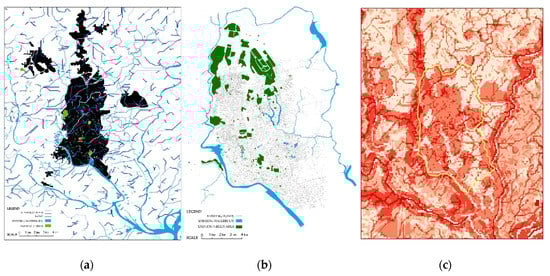 (a) Hidden streams and existing water network. (b) Existing green areas. (c) Suitable locations for green stormwater infrastructure (darker red represents highly suitable areas).