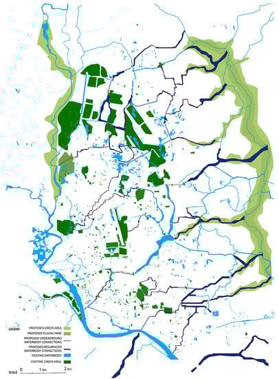 Figure 8 shows the water system as a combination of the existing ones and newly proposed corridors—based on re-surfaced/retrofitted hidden streams and existing groundwater recharge areas—for the BGI network. The new water corridors while crossing existing highly dense urban areas would follow different types of patterns—sometimes following the less integrated streets, channeling underground, or incorporating existing smaller but open water bodies to accommodate excess water in extreme cases. While crossing upstream, midstream, or downstream areas, the network would slow down stormwater runoff, store water in identified appropriate locations, work as usable water reservoirs, or drain the excess runoff to the downstream. Multi-scalar rainwater storage areas would supply water in the urban areas and reduce pressure on the groundwater resource. Detention areas in the downstream would be integrated with the highly urban tissue. Loose urban tissue in the upstream area would turn into bigger retention areas and be preserved against unplanned urbanization. In some cases, the streets with low integration values would be retrofitted as water carrying structures/blue-ways with different strategies appropriate in different locations, including both subsurface and surface flow systems. The green network following the water channels would have multi-functionality. Sometimes, in the case of stormwater overflow during heavy rainfall, it might work as a fluvial park, agriculture land, energy park, or meadow. This macro-scale blue-green parkway, while crossing urban areas, would become fragmented at different scales following existing characteristics of different urban densities. Sometimes, in areas closer to the urban core, it would serve as a series of smaller-size neighborhood parks and accommodate collective recreational activities in order to bring people closer to rapidly diminishing green spaces. The BGI network, therefore, would not only manage the water system of the city but also limit the development of environmentally sensitive areas where more productive and recreational spaces can be activated with different social or cultural programs along its trajectory.