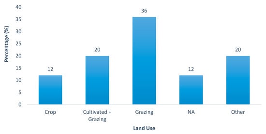 The percentage of articles, listed in Table 1, that state the specific land-use type in their VBG (valley bottom gully) studies. ‘NA’ (not available) denotes articles that do not report the land-use types of the gullied catchment. The ‘others’ land-use category includes land uses like brush and herbaceous.