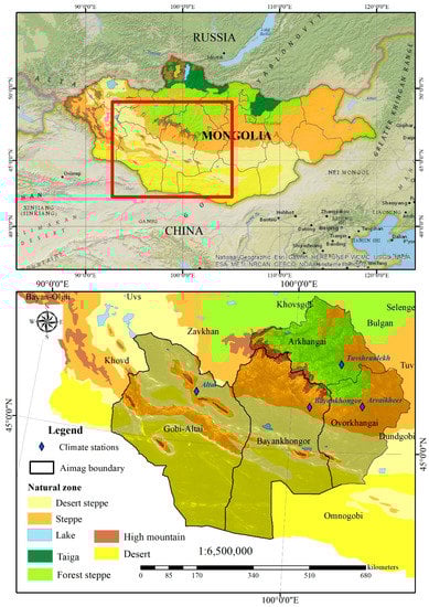- Gunin, P.D.; Vostokova, E.A.; Dorofeyuk, N.I.; Tarasov, P.E.; Black, C.C. Vegetation Dynamics of Mongolia; Kluwer Academic Publishers: Dordrecht, The Netherlands, 1999; ISBN 9789401591430. [Google Scholar]