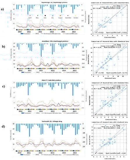 The National Agency of Meteorology, Hydrology and Environment Monitoring of Mongolia (NAMHEM) provided SM datasets from four different stations. In situ SM measurements used in this research were collected from 2010 to 2015. At each SM station, they collected one sample with the gravimetric method and converted the values to volumetric water content []. In situ measured SM data was obtained at a 10–15 cm depth at a monthly interval. For the majority of the stations, no data is available from April 8th and October 28th. For that reason, both these dates were excluded from the analysis.