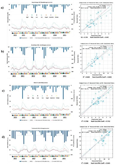 The SMOS L2 data from January 2010 to December 2015 were selected for the comparison analysis and to determine the SM distribution. The SMOS data was extracted using the ArcGIS tool “Extract multi values to point.” The data available are daily values, the monthly averages, and three parts per month. To accomplish further analysis, SMOS SM measurements were provided three times per month (normally between the 29th and 8th, 9th and 18th, and 19th and 28th of every month) during the warm period of the year, which runs from April until the end of October. The radiometric SMOS SM data with an average spatial resolution of 43 km. Since the SMOS satellite data covers a large spatial area, it appears more reasonable to use the monthly average values. The datasets are provided in the netCDF format, ranging from regional to global scales and at a temporal resolution of three days. For checking the accuracy of the data, the bias-correction technique was used for different evaluation aspects. The bias-correction technique emphasizes the statistical characteristics of data and successfully reduces the error in data outputs, and has become very popular for correcting biases in multiple datasets and analyses [,].