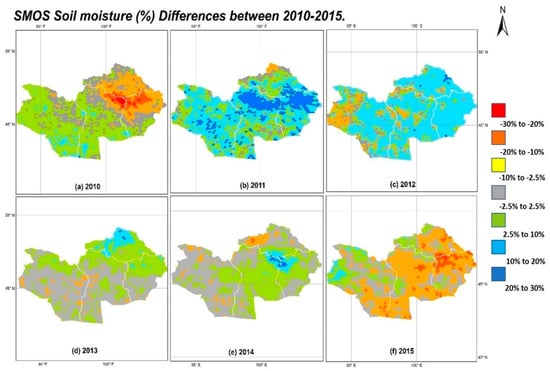 We examined the spatial variability of SM data with bias-corrected SMOS SM data. Figure 6 shows the result of a corrected SMOS SM spatial distribution maps (absolute differences from 2010 to 2015). The maps indicate that the SM increased approximately 20% to 30% in 2011 in the northern part of Bayankhongor and northern central part of Uvurkhangai provinces, respectively. For 2012, we observed that SM increased by 2.5% to 10% for most of the investigated area. Hence, significant changes of SM can be seen in bias-corrected SMOS SM map Figure 6b,c. However, a subsequent SM distribution showed a significant SM decrease (30%) in the steppe and forest-steppe regions that contain Kastanozems haplic soils (Figure 6f). Further, bias-corrected SM distribution maps allowed delineation of wet areas in the northwestern and southeastern dry areas of Mongolia. Hence, the bias-corrected SMOS SM products imply that they could be effective for soil moisture monitoring.