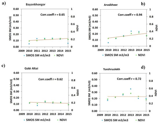 Scatter plot showing the annually-averaged correlation values obtained between SMOS SM and Moderate Resolution Imaging Spectroradiometer (MODIS) Normalized Difference Vegetation Index (NDVI) in the provinces: (a) Bayankhongor, (b) Arvaikheer, (c) Gobi-Altai, and (d) Tuvshruulekh.
