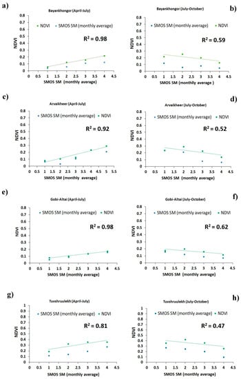 Scatter plot showing the monthly-averaged correlation values obtained from SMOS SM and MODIS NDVI during two seasons, April through June and July through October, in the provinces: (a,b) Bayankhongor, (c,d) Arvaikheer, (e,f) Gobi-Altai, and (g,h) Tuvshruulekh.
