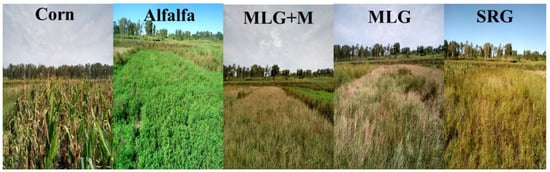 Images of the land use treatments in this study. Corn, corn cropland; Alfalfa, alfalfa forage land; MLG, monoculture grassland; MLG + M, monoculture grassland for hay (Mowing); SRG, successional regrowth grassland.