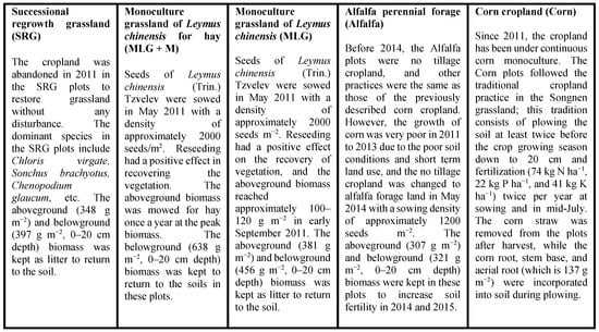 This experiment was organized as a completed block design with five land use treatments. In early May 2011, four adjacent blocks (each 60 × 50 m, 2 m buffer between the blocks) in the study area based on similar land use history were identified. Before this experiment (2004–2010), farmers grew rain fed maize (Zea mays L.) and sunflower (Helianthus annuus) in these blocks, following the traditional planting practices in Northeast China, which consists of plowing the soil down to 20 cm depth and applying 50–96 kg N ha−1, 20–45 kg P ha−1, and 15–45 kg K ha−1 fertilizers into the soils. The soil properties in these four blocks were homogeneous due to the continuous plowing. The five land use treatments consisted of corn cropland (corn, used as an indication of how the revegetation influences the soils in this study), alfalfa perennial forage land (alfalfa), monoculture grassland of Leymus chinensis (MLG), monoculture grassland of Leymus chinensis for hay (Mowing) once a year (MLG + M), and successional regrowth grassland (SRG) (Figure 2). Leymus chinensis is the native vegetation and is usually used as forage grass for grazing animals in the Songnen grassland. In the mowing grassland, Leymus chinensis is harvested as hay, and farmers sell the hay to livestock farms. Alfalfa has high saline and alkaline tolerance, and it has been introduced into the Songnen grassland as a high forage plant due to the high N and protein content []. The planting of forage grass used in this study could improve the income of local farmers and the development of animal husbandry. In each block, two greater plots of 12 × 50 m were for corn and alfalfa treatments, while three plots of 6 × 50 m for land use treatments of MLG, MLG + M, and SRG. There was a 1 m buffer among the five plots. The was no irrigation under the five land uses in this study. More information about the treatments of land uses is presented in Figure 3 [,].