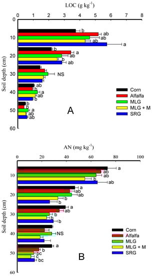 The LOC content under the land use of SRG was remarkably higher than that under corn in the 0–10 cm depth, while it was significantly higher under alfalfa in the 10–20 cm depth than the corn and MLG + M treatment (Figure 4A). In the 20–50 cm depth, the highest LOC content was found under the MLG treatment. The average LOC contents in the 0–50 cm depth were 32% (0.56 g kg−1), 28% (0.49 g kg−1), 15% (0.26 g kg−1), and 32% (0.57 g kg−1) higher under alfalfa, MLG, MLG + M, and SRG treatment, respectively, than that under corn treatment.