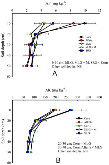 The differences of AP and AK contents among the soil depths in the 0–50 cm depth were very narrow except the 0–10 cm depth (Figure 5). Compared with the land uses of MLG, MLG + M, and SRG, land use of corn had a higher AP content at the 0–10 cm depth. However, land use treatments did not change the AP contents at the 10–50 cm depth (Figure 5A). The average AP contents in the 0–50 cm depth under the land uses of corn, alfalfa, MLG, MLG + M, and SRG were 4.1, 3.8, 3.4, 3.1, and 3.4 mg kg−1, respectively. The highest AK contents were all found under the MLG treatment in the 0–50 cm depth (Figure 5B). However, significant differences were only found between MLG and corn treatment in the 20–40 cm depth and between MLG and alfalfa treatment in the 30–40 cm depth. The average AK contents in the 0–50 cm depth under corn, alfalfa, MLG, MLG + M, and SRG treatment were 102.9, 112.2, 137.5, 108.7, and 125.8 mg kg−1, respectively.