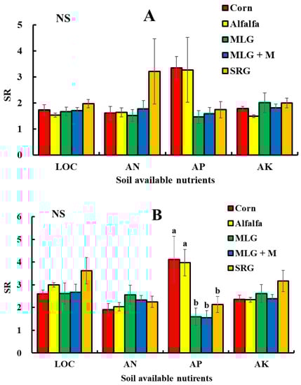 The SR of LOC, AN, and AK in the 0–10/10–20 cm and in the 0–10/20–30 cm (Figure 6) were not affected by the different land uses. Land uses of corn and alfalfa had remarkably higher SR values of AP in the 0–10/20–30 cm depth than the land uses of MLG, MLG + M, and SRG. However, the differences of the SR value for AP in the 0–10/10–20 cm depth were not significant among the five treatments. All the SR values of LOC, AN, AP, and AK in the 0–10/10–20 cm depth were all <2 except the values of AN under SRG treatment, AP under corn and alfalfa treatment, and AK under MLG treatment. However, the SR values of LOC, AN, AP, and AK in the 0–10/20–30 cm depth were all >2, except the values of AN under corn treatment and AP under MLG and MLG + M treatment.