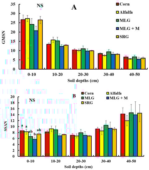 Values of GMSN in the 0–50 cm depth and SSAN in the 10–50 cm depth were not influenced by the changes of land use (Figure 7). The highest GMSN value was found under alfalfa in 0–20 cm depth, while it was highest under MLG treatment in the 20–50 cm depth (Figure 7A). The average GMSN values in the 0–50 cm depth under corn, alfalfa, MLG, MLG + M, and SRG treatment were 13.1, 13.2, 13.3, 11.2, and 12.7, respectively. The SSAN values under corn and alfalfa treatment in the 0–10 cm depth were markedly greater than the land use of MLG + M (Figure 7B). The average SSAN values in the 0–50 cm depth under corn, alfalfa, MLG, MLG + M, and SRG treatment were 9.5, 9.0, 9.7, 8.6, and 9.1, respectively.