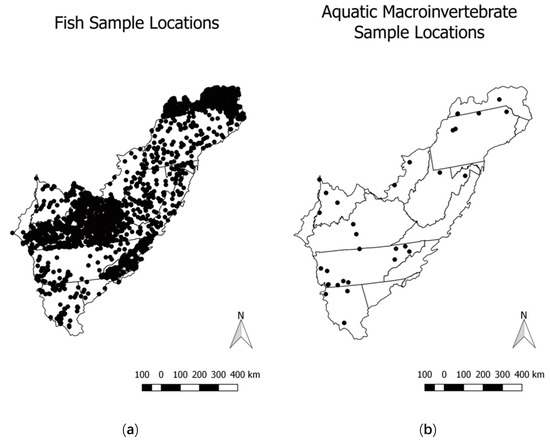 27]. Our fish community dataset was comprised of 2991 sample sites across the region and was somewhat sparse (2991 locations within 266,309 HUC12 watersheds = 1.1%), but it exhibited good spatial distribution (