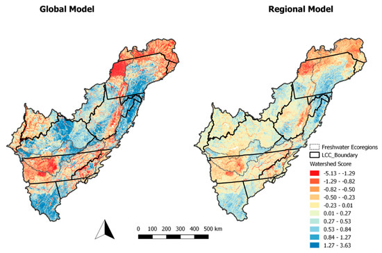 31]. We aggregated the 11 ecoregions that comprised the App LCC into four due to low sample site numbers in some Freshwater Ecoregions. The four aggregated ecoregions and their composite Freshwater Ecoregions were Atlantic Slope (Appalachian Piedmont, Chesapeake Bay, Northeast US and Southeast Canada Atlantic Drainages), Cumberland (Cumberland River Basin), Ohio (Teays-Ohio and Laurential Great Lakes River Basins), and Tennessee (Tennessee and Mobile Bay River Basins). The regional models were successfully run for fish, but we were unable to model aquatic macroinvertebrates regionally due to the lack of spatial coverage, and we therefore retained models for the entire geography for aquatic macroinvertebrates.