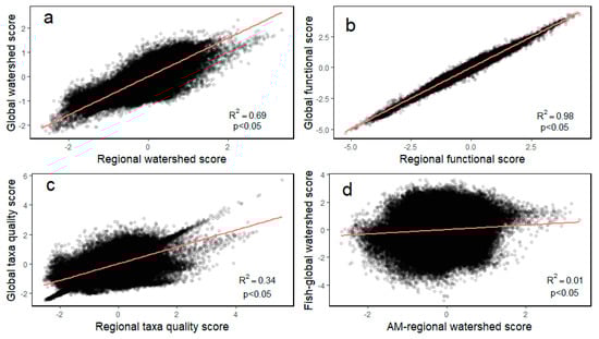 Additionally, the Pearson correlation coefficient between the aquatic macroinvertebrate watershed score and those of the global (