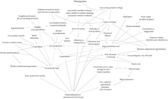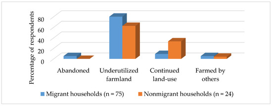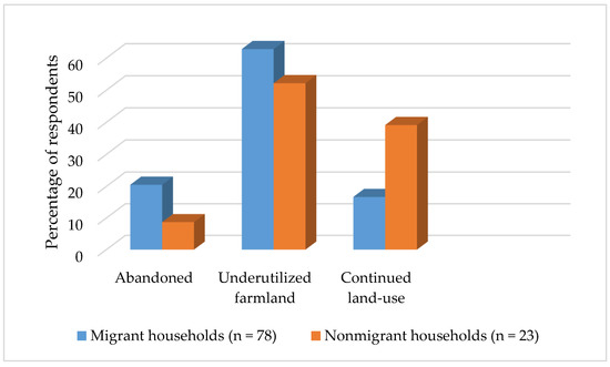 Overall, the underutilization and abandonment of farmland was higher in migrant households than nonmigrant households. This trend is expected to increase in the future, in accordance with recent migration-related studies in Nepal and other parts of the world, where migrant households were more likely to permanently exit farming [49,50,51,52] or decrease arable land-use intensity [3].