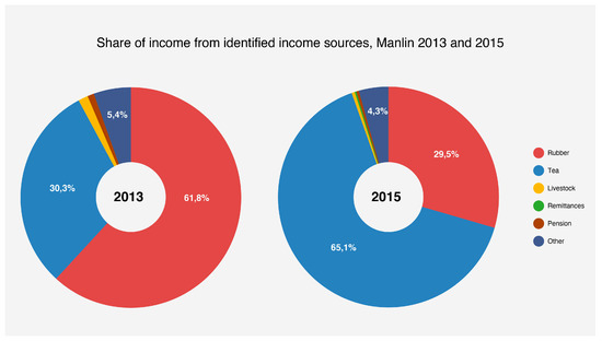 Rubber and tea were the two dominant income sources for households in Manlin in both 2013 and 2015, but the share from rubber income to total income had decreased: In 2013, rubber income made up approximately 60 percent of total income compared to about 30 percent in 2015 (Figure 1). Although there was no significant difference in the average total household income from 2013 to 2015, the average income from rubber and tea had changed significantly (Table 2). Besides rubber and tea income, there were no significant changes in other income sources at a village level.