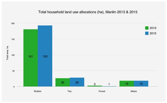 Changes in household land use allocation in Manlin village from 2013 to 2015, measured in ha. The category “Forest” refers to areas of forests without rubber or tea.