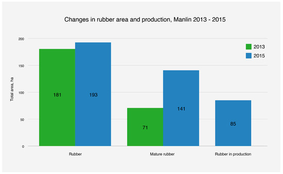 Between 2013 and 2015, there was little change in overall or individual land use types (Figure 2 and Figure 3). The area under rubber was by far the most dominant land use and had increased slightly from 181 to 193 ha, corresponding to about 7 percent in two years (Figure 2). This indicates that the decline in rubber prices had not affected local land use decisions so far. Because rubber trees are not taken into production until they are approximately 7–8 years, the total area of rubber does not reflect the current economic potential as it includes trees of all ages. Dividing the area under rubber plots into mature and immature trees showed that the area of mature rubber plots had increased almost 100 percent from 2013 to 2015, increasing the potential rubber income for local households (Figure 3). By 2015, the area of rubber in production had increased since 2013, despite that only about 60 percent of the mature rubber trees were actually in production by 2015, leaving the potential income from rubber unrealized (Figure 3).