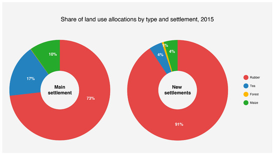 Allocation of land use in Manlin by settlements measured in ha. The pie charts show that rubber is the dominant land use (measured by area for all cases), followed by tea and maize in the main settlement, and maize and tea in the new settlements.