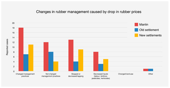 The share of households who have changed management practices due to the drop in rubber prices, shown for Manlin overall and the main and new settlements.