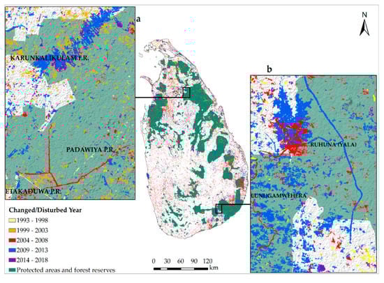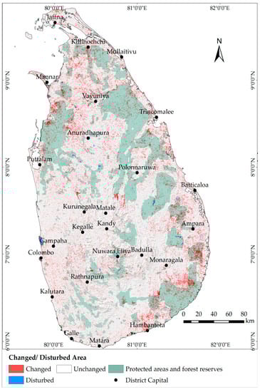 Areas that experienced a disturbance and/or land use land cover change (LULCC) over the 1993 to 2018 period and the distribution of protected areas and forest reserves across Sri Lanka [55].