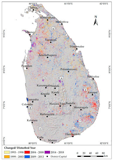 Distribution of land cover changes and/or disturbances by defined periods (1993 to 2018). The numbers refer to examples of land cover diversification projects that occurred during the study period: 1. The southern expressway (the first highway in Sri Lanka) and the railway line, 2. Rambakenoya reservoir, 3. Mattala international airport, 4. Moragahakanda reservoir project, 5. Deduru Oya reservoir project, 6. Yaldewi railway line, 7. Lunugamwehera reservoir project and 8. Colombo International Financial City project.