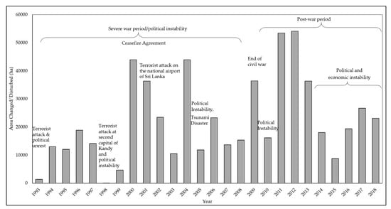 Considering the chronology of annual LULCC in Sri Lanka, as shown in Figure 5, the period starts in the early 1990s with relatively low annual change. This was due to political instability resulting from a state of emergency following the assassination of the president in 1993. Subsequently, a new series of infrastructure development programs were introduced under new leadership in 1994 and 1995, resulting in LULCC throughout the dry zone. The area under home gardens increased in many districts during this period, and forest cover dramatically dropped [80]. However, the 1990s were a particularly unstable period for Sri Lanka due to many sociopolitical crises, including a civil war.