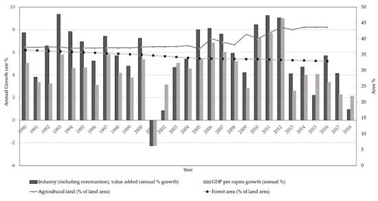 Annual growth rates of GNP (gross national production) per capita and value-added industry (including construction) in Sri Lanka from 1990 to 2018, area used for agricultural purposes and forested lands. Gross domestic production (GDP) annual growth [21]. Source: The World Bank, national account data.