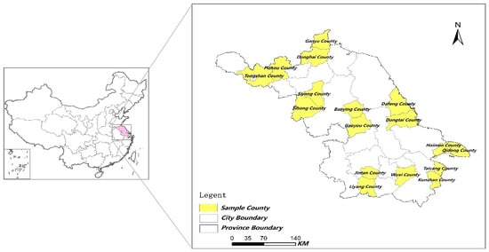 The Jiangsu province is located in the middle of the Yangtze River Delta (Figure 1). It covers about 1.76 million ha with an average elevation below 50 m. The northern subtropical monsoon climate dominates this region year round, with a mean annual temperature of 17.5 °C and a mean annual rainfall of 1055 mm, all of which are beneficial for agricultural production. Jiangsu has 4.58 million ha of arable land, with 0.057 ha of arable land per capita. The topography in Jiangsu is mainly plains which cover an area of more than 70,000 square km, accounting for more than 70 percent of the province. Economic development is not balanced across the regions of Jiangsu. Southern Jiangsu Province is one of the fastest growing areas of eastern China’s economy. With a geographic proximity to the most industrialized city of Shanghai, this region is renowned for its export-oriented, predominantly high-tech manufacturing industry. Besides, agricultural modernization in Jiangsu is at the forefront in China, and the results in the province may be a reference for the whole country.