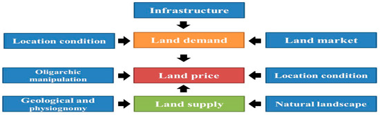According to the theory of land supply and demand, in a completely competitive market, the curve of land supply and demand determines its price, as well as the corresponding supply and demand [25]. From the perspective of geography, land demand is mainly affected by market factors, location conditions, and supporting facilities [26]. The natural supply of land is mainly affected by the local natural landscape, geology, and geomorphology [26]. Meanwhile, monopoly group manipulation and government macro-control will also have an impact on urban land prices (Figure 1).