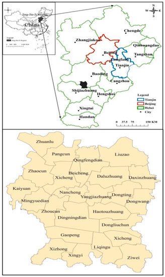 The study area is located between 38°14′–38°40′ N and 114°48′–115°15′ E. Dingzhou City is in the west of Hebei Province (Figure 2). Dingzhou City, including 25 towns (Nancheng, Beicheng, Xicheng, Liuzao, Qingfengdian, Pangcun, Zhuanlu, Mingyuedian, Dingningdian, Dongting, Daxinzhuang, Dongwang, Gaopeng, Xingyi, Liqingu, Ziwei, Kaiyuan, Changanlu, Zhoucun, Xizhong, Dongliuchun, Haotouzhaung, Yangjiazhuang, Daluzhaung, and Xicheng), is one of the pilots of the national rural land system reform in China [53]. With a total area of 1283 km2 and a total population of 1.3 million, it is the most populous city in Hebei Province, China.