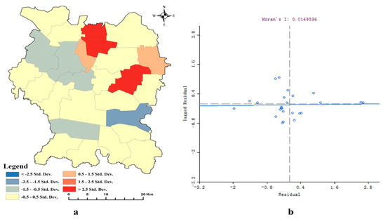 Parameter estimation results of GWR. (a) Residual of GWR’s distribution; (b) Moran’s I.